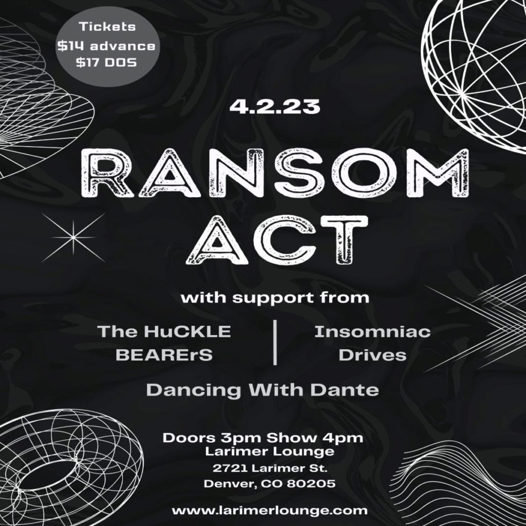 Larimer Lounge Presents Ransom Act with Dancing with Dante, Insomniac Drives and The Huckle Bearers on Sunday, April 2nd. 16+, under 16 admitted with ticketed guardian