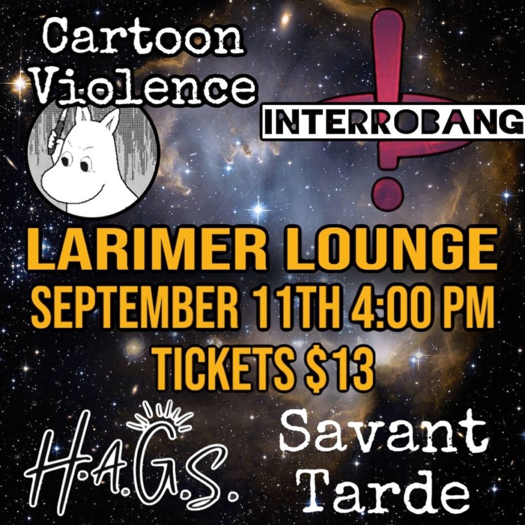 Larimer Lounge Presents Cartoon Violence with Interrobang, Savant Tarde and H.A.G.S on Sunday, September 11th. -16+, under 16 admitted with ticketed guardian