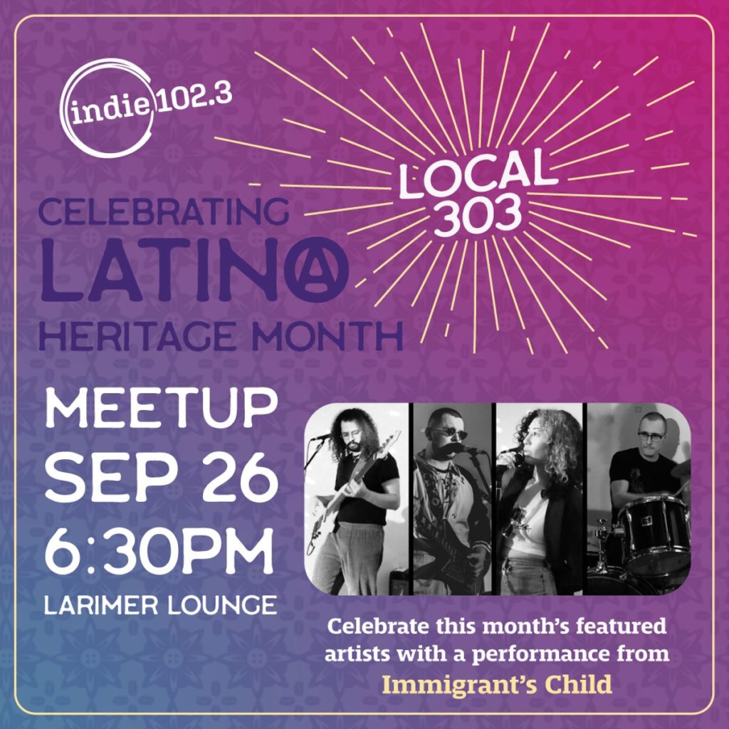 Indie 102.3 Presents Local 303 Meetup (FREE EVENT) — Indie 102.3’s Local 303 Meetup is live and in person on Monday, September 26th at 6:30-9:00p. Details include a live performance from Immigrant’s Child! Admission is free and this event is all ages, so get ready to come out of your caves and mingle with some of your favorite Colorado bands and radio hosts!