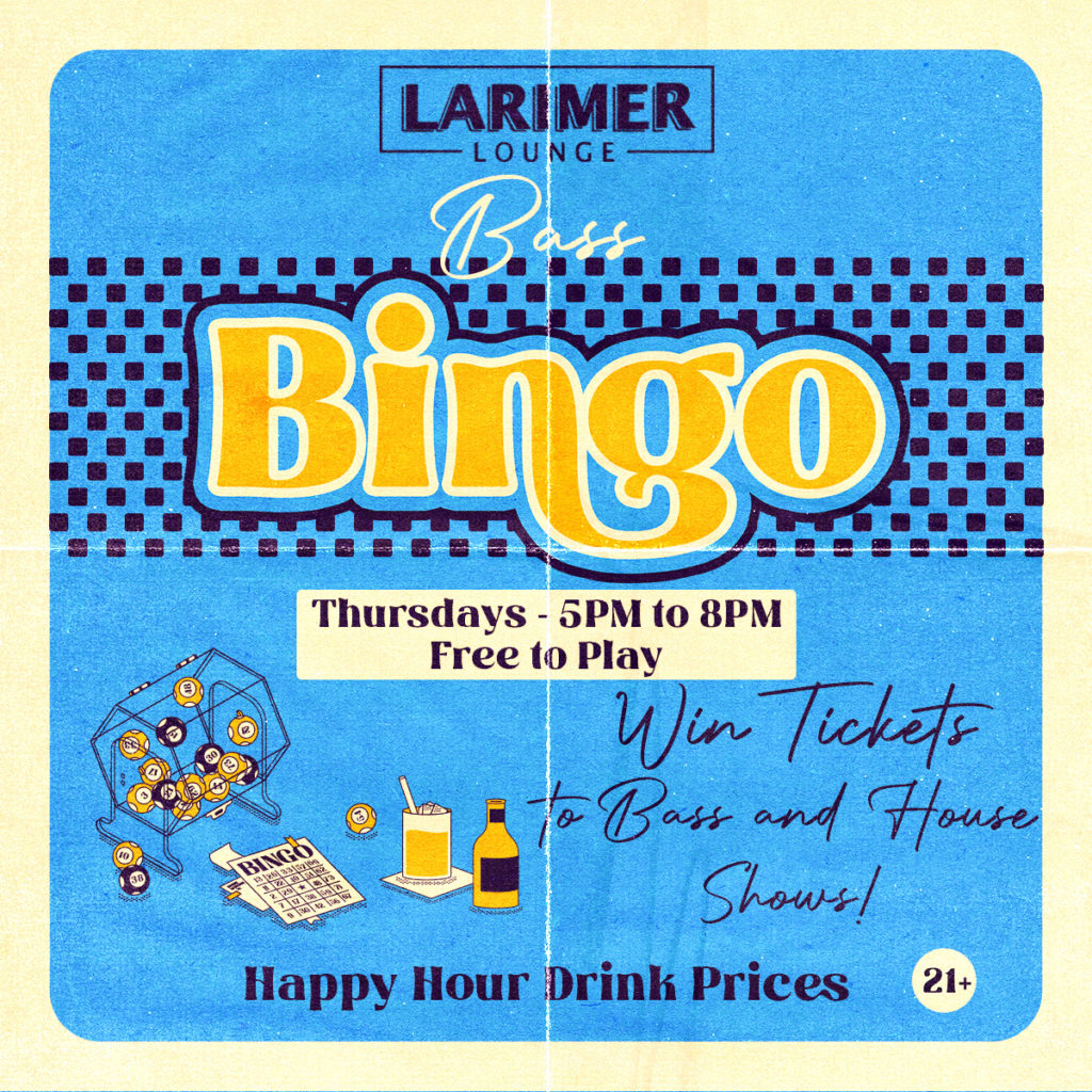 Larimer Lounge Presents BASS BINGO Thursday, February 27. Enjoy 7-8 rounds of bingo, happy hour drink prices, and win tickets to Bass and House shows, as well as other fun music related prizes!! PRIZES THIS WEEK: CRANKDAT – MISSION BALLROOM MAX STYLER – OGDEN THEATER HEYZ – BLUEBIRD THEATER NOTD – BLUEBIRD THEATER QRION – BLUEBIRD THEATER SULLIVAN KING – FRIDAY SHOW – MISSION BALLROOM BOOGIE T – RED ROCKS In addition to winning tickets we will also be selling tickets to your favorite bass & house shows with no service fees!!21+