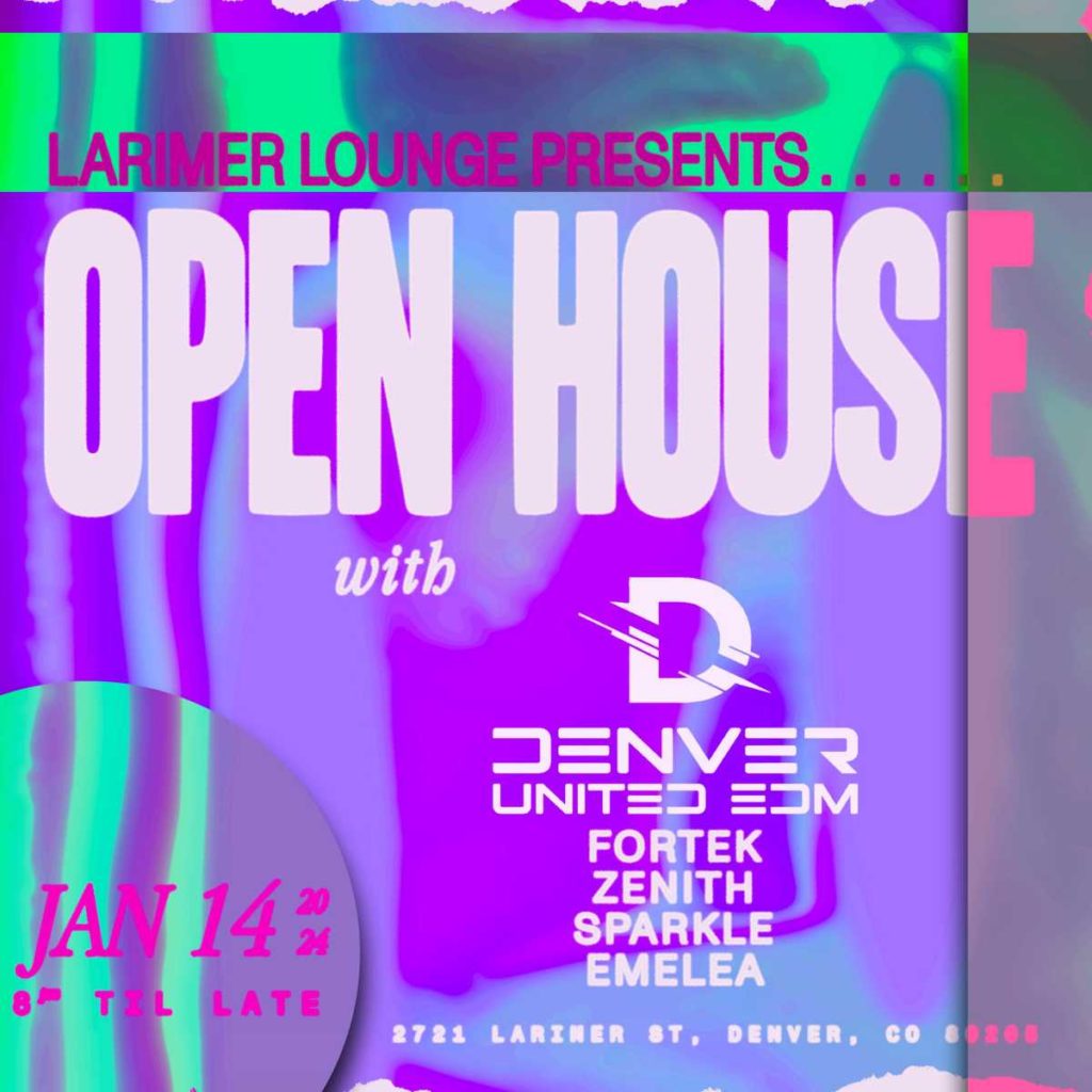 Denver United EDM presents Open House Featuring Fortek, Zenith, Sparkle and Emelea on Sunday, January 14th.AGES 21+ SIGN UP FOR OUR OPEN HOUSE SMS LIST: https://larimerlounge.com/openhousesmslist/ Be the first to know about special promos, guest list opps, presale codes, and beyond!