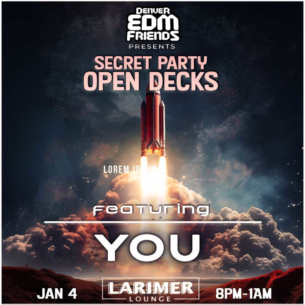 Denver EDM Friends present Open Decks on Thursday, January 4th.. AGES 16+ SIGN UP FOR OUR OPEN HOUSE SMS LIST: https://larimerlounge.com/openhousesmslist/ Be the first to know about special promos, guest list opps, presale codes, and beyond!