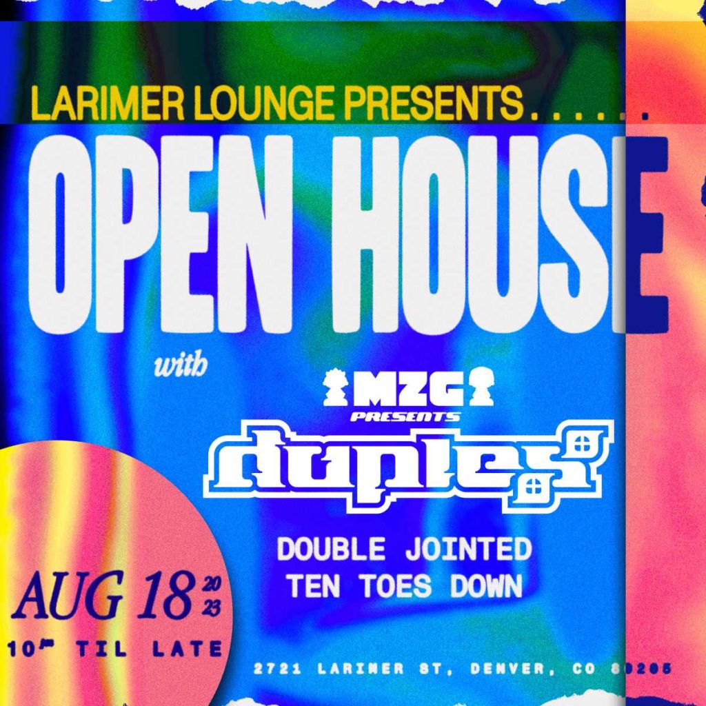 Larimer Lounge presents Open House feat. MZG’s Duplex w/ Double Jointed and TEN TOES DWN on Friday, August 18 –AGES 21+ SIGN UP FOR OUR OPEN HOUSE SMS LIST: https://larimerlounge.com/openhousesmslist/ Be the first to know about special promos, guest list opps, presale codes, and beyond!