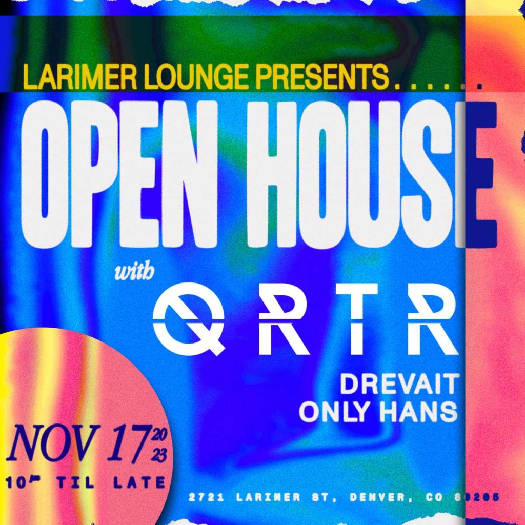 Larimer Lounge presents Open House featuring QRTR with Drevait and Only Hans on Saturday, Nov 17. AGES 21+ SIGN UP FOR OUR OPEN HOUSE SMS LIST: https://larimerlounge.com/openhousesmslist/ Be the first to know about special promos, guest list opps, presale codes, and beyond!