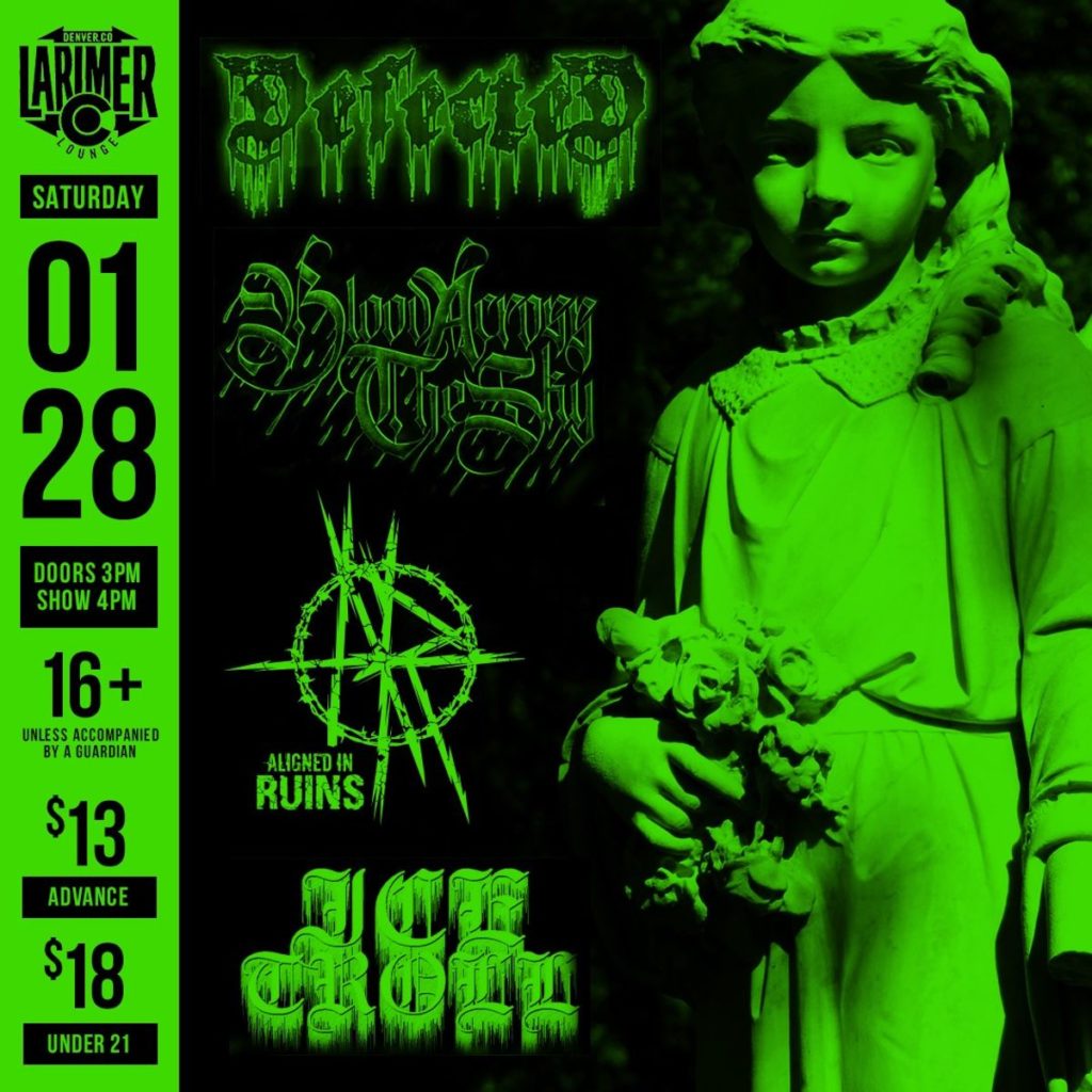 Larimer Lounge Presents Defected with Blood Across the Sky, Aligned in Ruins and Ice Troll on Saturday, January 28th. -16+, under 16 admitted with ticketed guardian