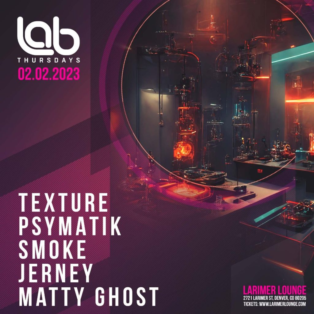 Larimer Lounge Presents Lab Thursdays with Texture, Psymatik, Smoke, Jerney and Matty Ghost on Thursday, February 2nd. -16+, under 16 admitted with ticketed guardian