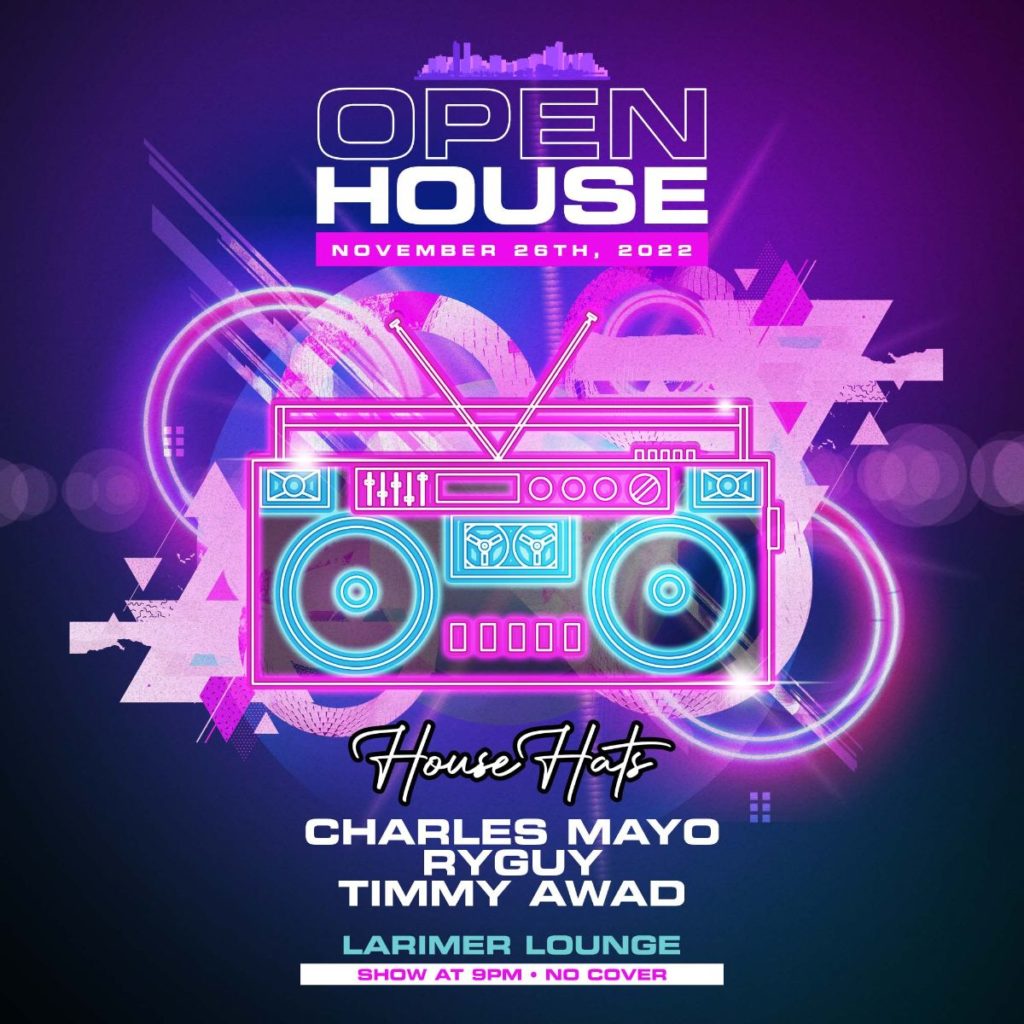 Open House presented by House Hats Featuring Charles Mayo, Ryguy and Timmy Awad (FREE EVENT BEFORE 11PM) on Saturday, November 26th– AGES 21+ SIGN UP FOR OUR OPEN HOUSE SMS LIST: https://larimerlounge.com/openhousesmslist/ Be the first to know about special promos, guest list opps, presale codes, and beyond!