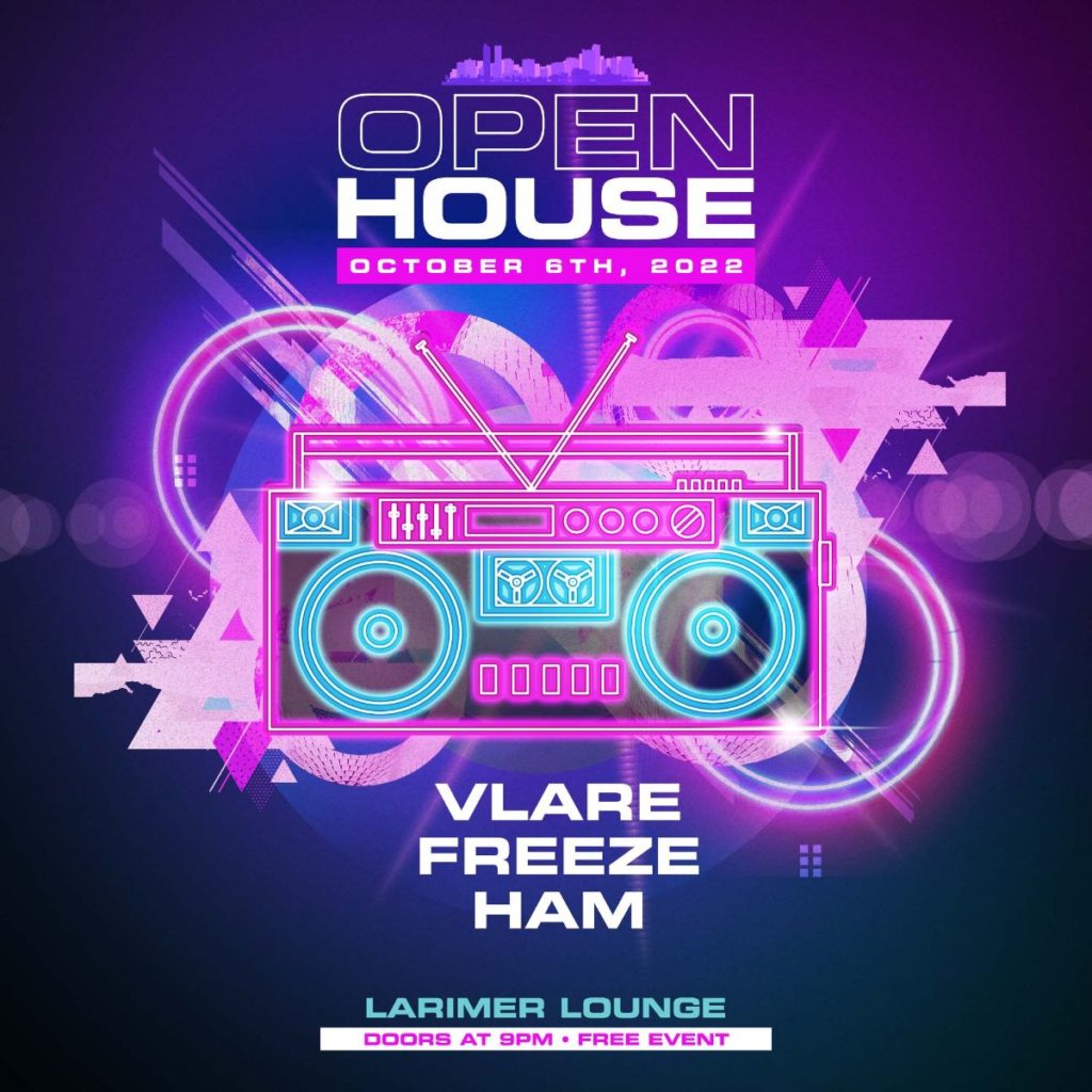 Larimer Lounge presents Open House with Vlare, FREEZE and Ham (FREE EVENT) on Thursday, October 6th. AGES 21+ SIGN UP FOR OUR OPEN HOUSE SMS LIST: https://larimerlounge.com/openhousesmslist/ Be the first to know about special promos, guest list opps, presale codes, and beyond!