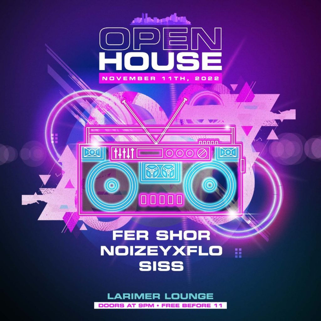 Larimer Lounge Presents Open House with Fer Shor, NoizeyxFLO and siss (FREE EVENT BEFORE 11PM) on Friday, November 11th. AGES 21+ SIGN UP FOR OUR OPEN HOUSE SMS LIST: https://larimerlounge.com/openhousesmslist/ Be the first to know about special promos, guest list opps, presale codes, and beyond!