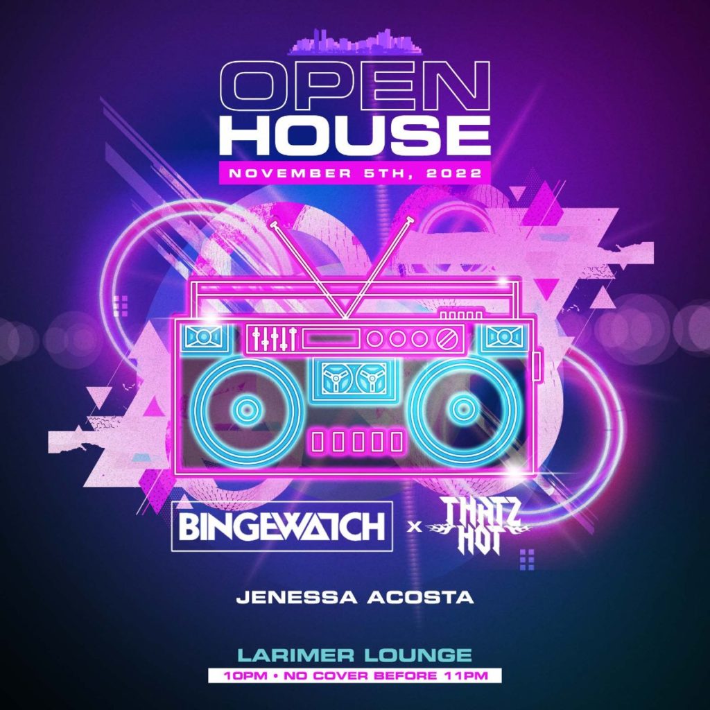 Larimer Lounge presents Open House featuring Bingewatch x Thatz Hot with Jenessa Acosta (FREE EVENT BEFORE 11PM) on Saturday, November 5th– AGES 21+ SIGN UP FOR OUR OPEN HOUSE SMS LIST: https://larimerlounge.com/openhousesmslist/ Be the first to know about special promos, guest list opps, presale codes, and beyond!