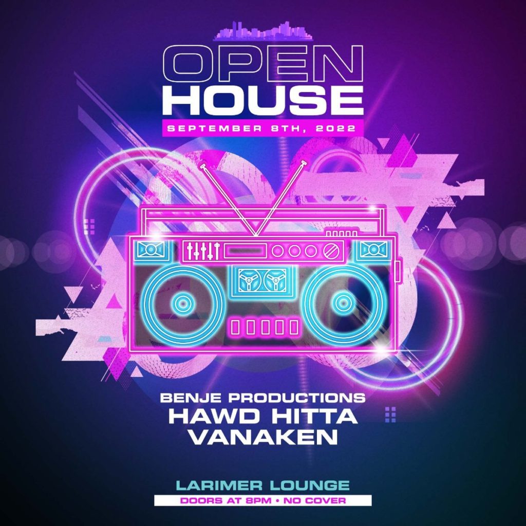 Larimer Lounge Presents Open House with Benje Productions ft. HAWD HITTA and Vanaken (FREE EVENT BEFORE 11PM) on Thursday, September 8th. AGES 21+ SIGN UP FOR OUR OPEN HOUSE SMS LIST: https://larimerlounge.com/openhousesmslist/ Be the first to know about special promos, guest list opps, presale codes, and beyond!