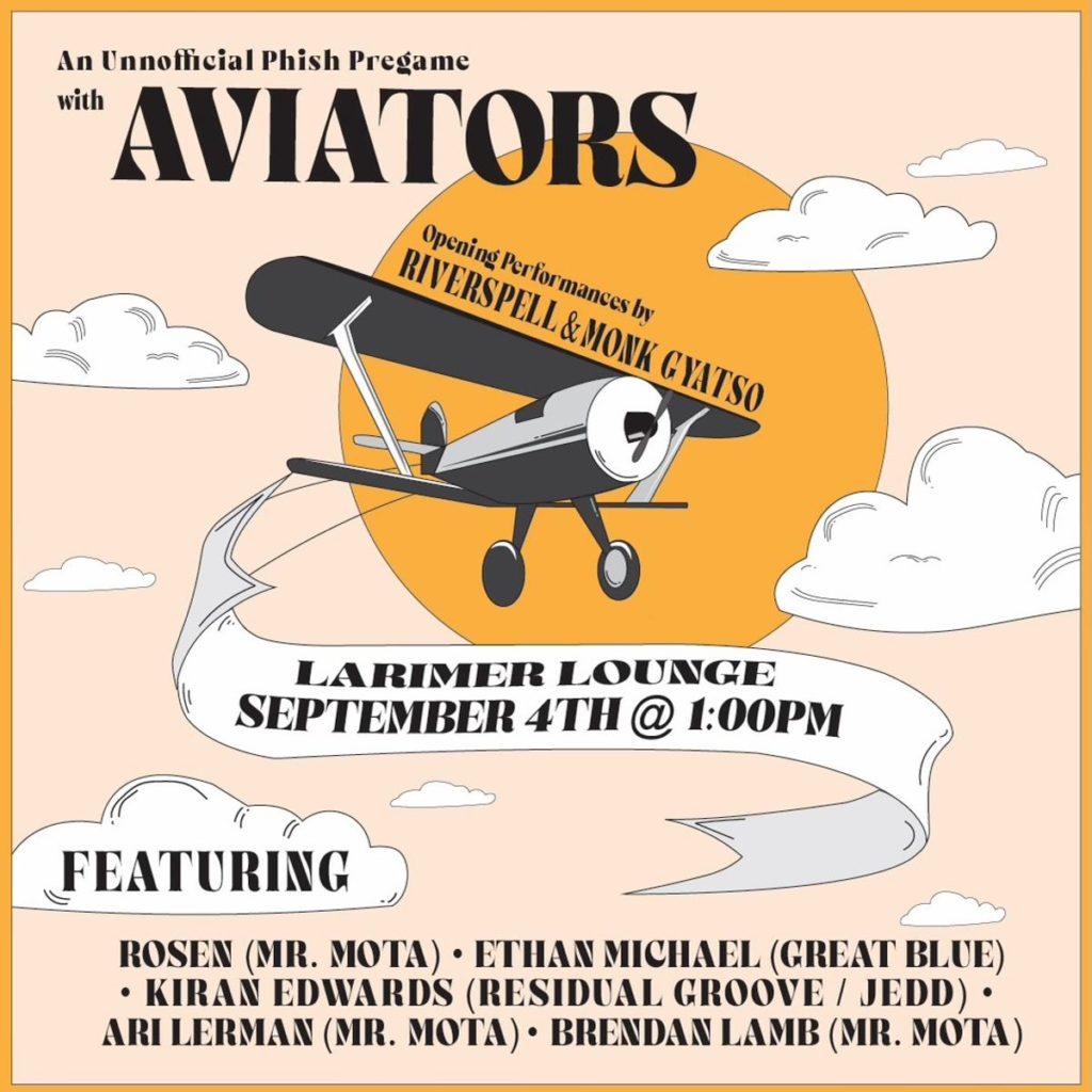 Larimer Lounge Presents Phish Preparty with Aviators featuring members of Great Blue, Mr Mota and Residual Groove on Sunday, September 4th. -16+, under 16 admitted with ticketed guardian