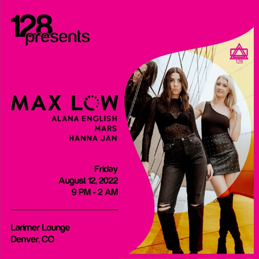 128 Productions presents Max Low with Alana English, MARS and Hanna Jan on Friday, August 12 — SIGN UP FOR OUR OPEN HOUSE SMS LIST: https://larimerlounge.com/openhousesmslist/ Be the first to know about special promos, guest list opps, presale codes, and beyond!