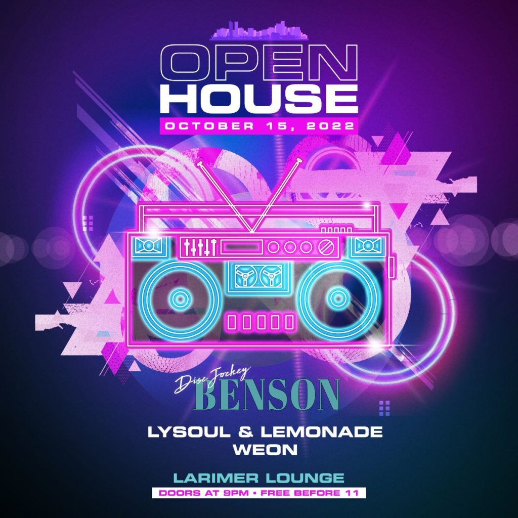 Larimer Lounge Presents Open House feat. Benson with Lysoul & Lemonade and Weon on Saturday, October 15th. FREE SHOW. No ticket or reservation necessary. First come, first served. AGES 21+