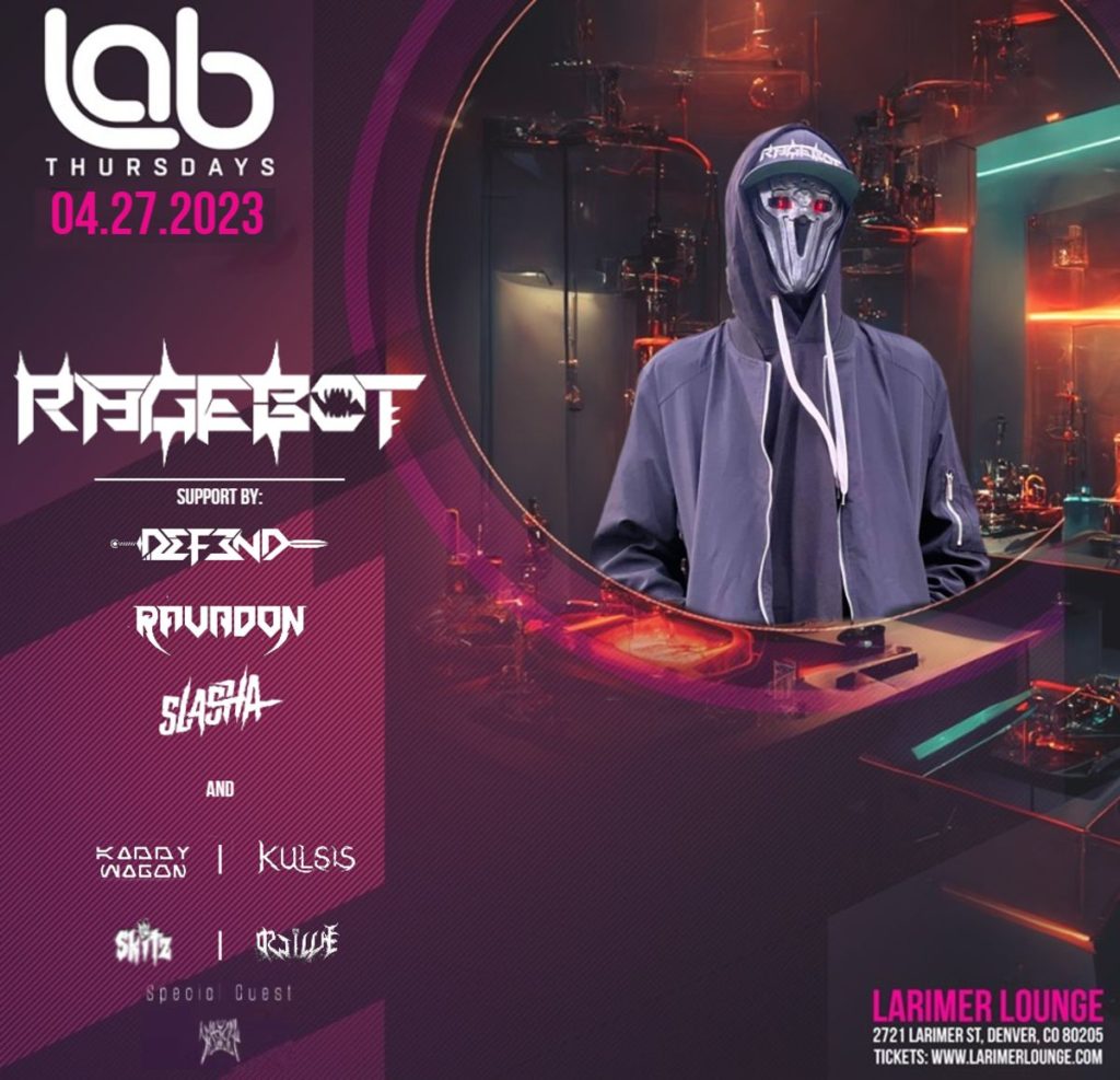 Lab Thursdays Presents Ragebot, Defend, Ravadon, Slasha, Kaddy Wagon, Kulsis, Skitz and Oscillate on Thursday, April, 27th. -16+, under 16 admitted with ticketed guardian