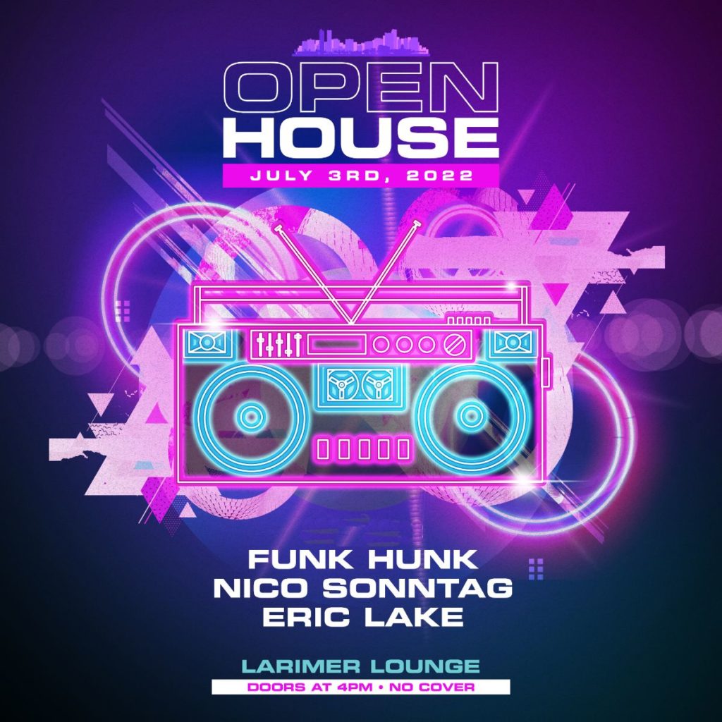 Larimer Lounge presents Open House with Funk Hunk, Nico Sonntag and Eric Lake (FREE) on Sunday, July 3rd at 5pm. AGES 21+ SIGN UP FOR OUR OPEN HOUSE SMS LIST: https://larimerlounge.com/openhousesmslist/ Be the first to know about special promos, guest list opps, presale codes, and beyond!