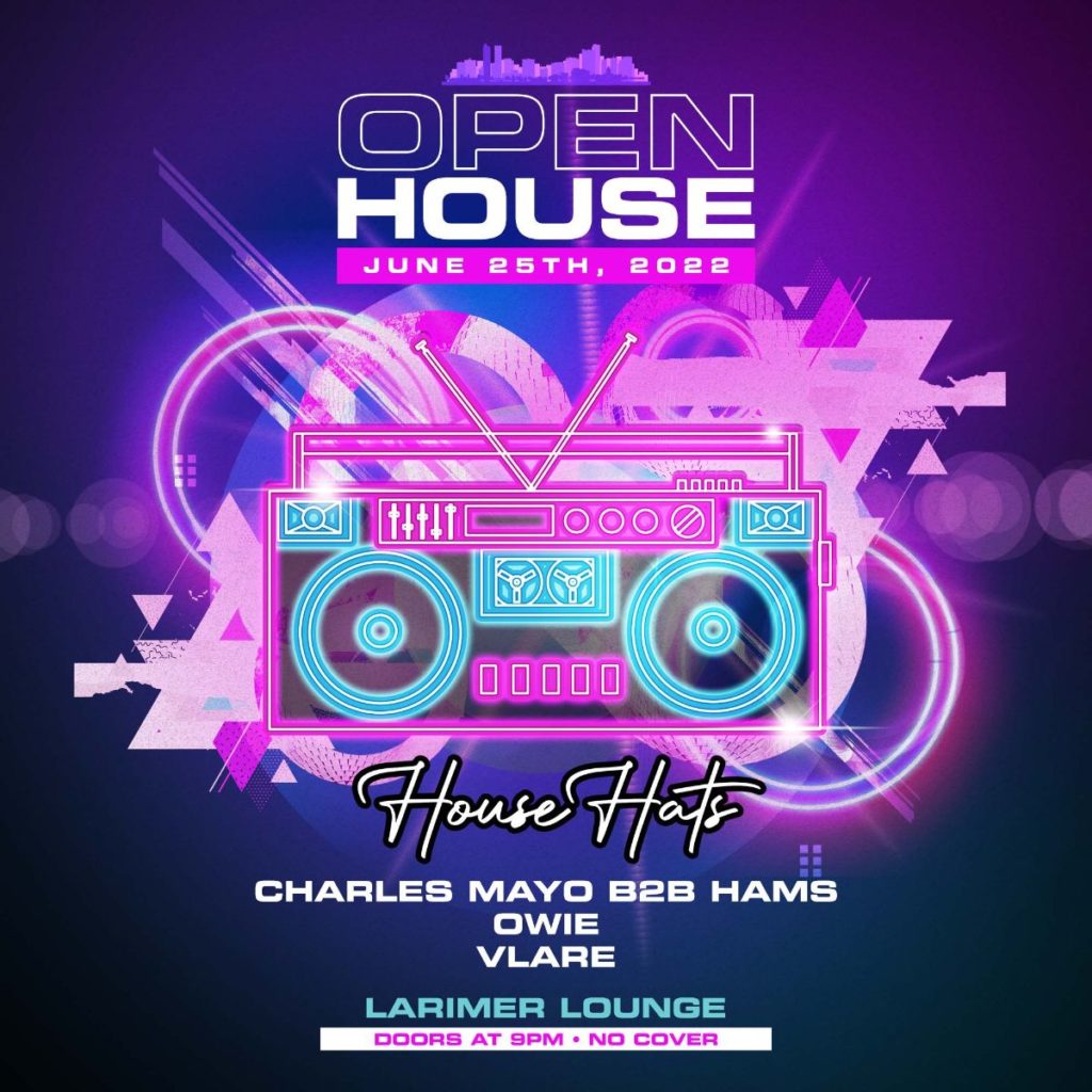 Larimer Lounge presents Open House with House Hats, Charles Mayo B2B Hams, Owie, + Vlare (FREE) on Saturday, June 25th at 9pm. AGES 21+ SIGN UP FOR OUR OPEN HOUSE SMS LIST: https://larimerlounge.com/openhousesmslist/ Be the first to know about special promos, guest list opps, presale codes, and beyond!
