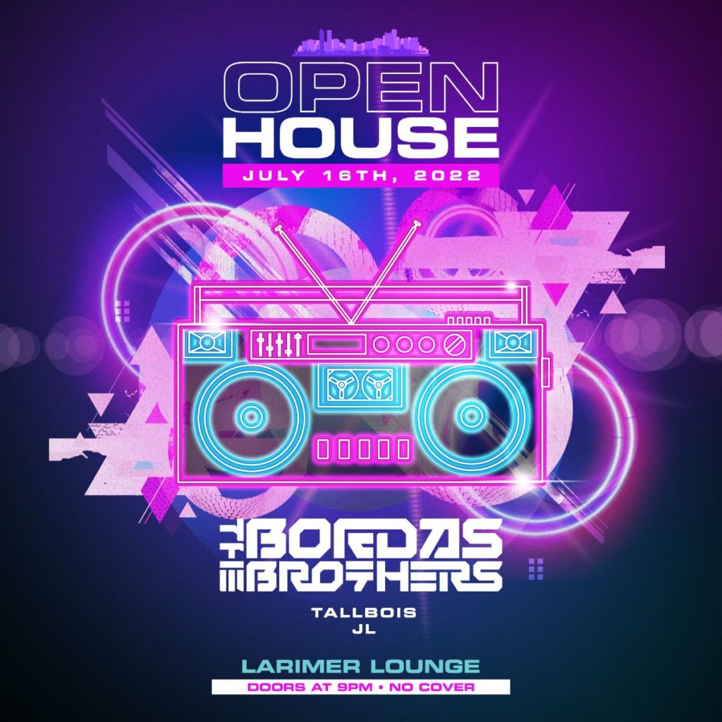 Larimer Lounge presents Open House featuring The Bordas Brothers, TALLBOIS and JL on Saturday, July 16 — AGES 21+ SIGN UP FOR OUR OPEN HOUSE SMS LIST: https://larimerlounge.com/openhousesmslist/ Be the first to know about special promos, guest list opps, presale codes, and beyond!